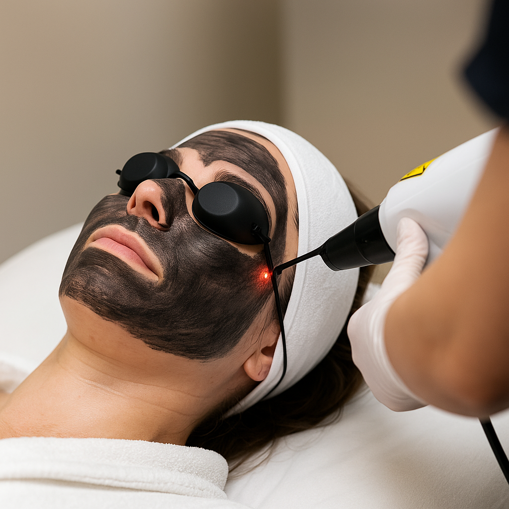 Laser Carbon Peeling is a non-invasive skincare treatment that combines a carbon lotion with laser technology to deeply cleanse and rejuvenate the skin. It involves applying a thin layer of liquid carbon over the face, which penetrates deep into the pores. A laser beam is then passed over the skin, causing the carbon to heat and exfoliate dead skin cells, remove impurities, and stimulate collagen production.
